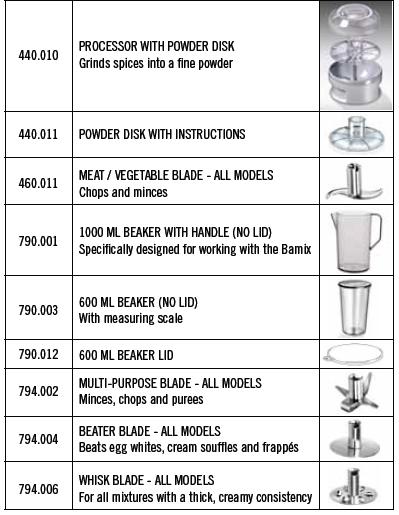 Multipurpose blade #794.002 $13.95 Unavailable | Chops raw or cooked vegetables and fruit, frozen fruit for ice-cream. Strains vegetables for soups and sauces. Purées baby food direct in the pan on the stove (no pouring from one container to another plus washing-up). Mixes doughs for cakes, biscuits or pancakes. Liquidizes fruit and berries for sweets and jams. Crushes ice-cubes in seconds. | | | Beater #794.004 $11.95 | Beats mousse and egg-whites. Whips cream and even skim milk into a diet topping. Blends sauces (béchamel, hollandaise). Homogenizes and aerates shakes and creams. Foams up cream soups and different foam desserts. For everything which should be light and fluffy. | | | Whisk #794.006 $11.95 Unavailable | Stirs and creams pancakes, omelets and batters. Mashes potatoes. Creams puddings. Emulsifies salad dressings - and even cosmetics. You whisk your mayonnaise within seconds (and it is natural, without additives and preservatives!). You can mix your cocktail drinks better than a bar-keeper. For all mixtures with a thick or cream consistency. | | | Meat- and Vegetable blade #460.011 $17.95 Unavailable | Chops and minces small quantities of raw and cooked meat, raw or cooked fish. Perfect for vegetables with coarse fibers. |  | | Processor w/ Powder Disk #440.010 $45.95 Unavailable | Suitable for dry and wet ingredients. Grinds all kinds of dry and wet food like dried vegetables, chocolate, sugar to icing sugar, spices like cinnamon, vanilla, nutmeg etc., coffee, dried bread to bread crumbs, dried fish, dried mushrooms, all kinds of nuts, peanut to peanut butter, grains and poppy-seeds. Mixes small quantities of spreads and baby food. Minces garlic, onion, coconut, chili, vegetables, horse-radish, all kinds of herbs, small quanitities of meat or fish, mimosa egg. |  | | Stand #64112 | Stores and makes easily accessible the bamix and its plug-on workheads. Installed over your working surface, bamix is always to hand.. | | | Wall-bracket (Black) #64120 $7.95 Unavailable